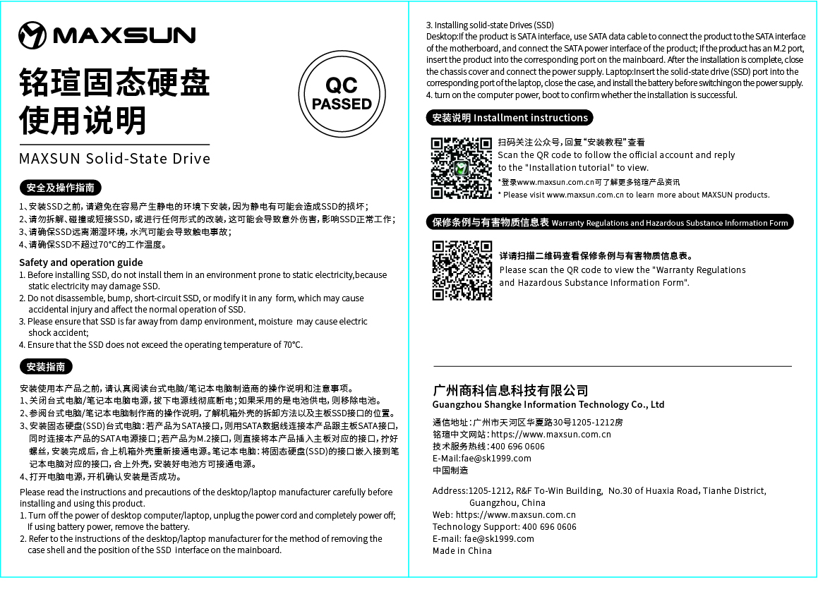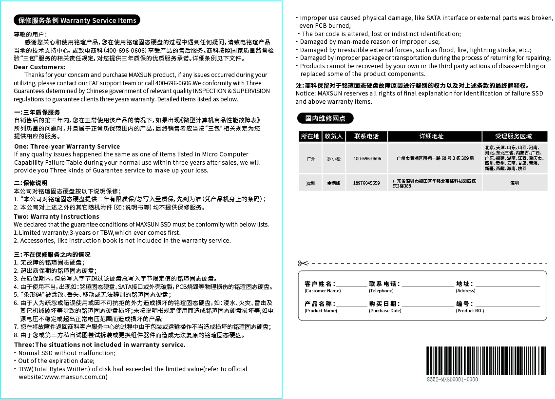 感谢您关心和使用铭瑄产品,您在使用铭瑄固态硬盘的过程中遇到任何疑问,请致电铭瑄产品当地的技术支持中心,或致电商科(400-696-0606)享受产品的售后服务。商科按照国家质量监督检验“三包”服务的相关责任规定,向您提供三年有限质保/总写入量质保(先到为准)的优质服务承诺。详细条例见下文件。