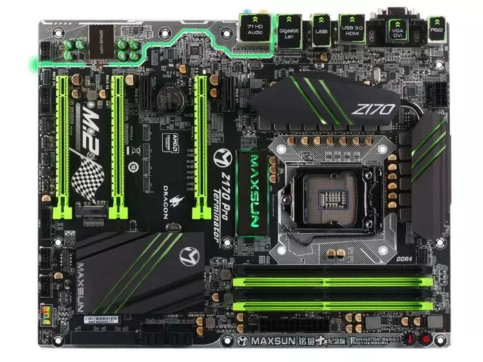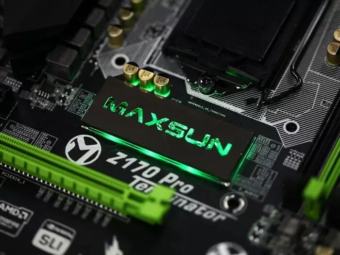 铭瑄 Z170PRO 终结者滤坝数模分割线、铭瑄品牌标志和内存部分都带有Gamer-Lit信仰炫光设计,让主板在黑暗中迸发出酷炫的绿色灯光,让侧透主机更有格调,更有游戏激情。