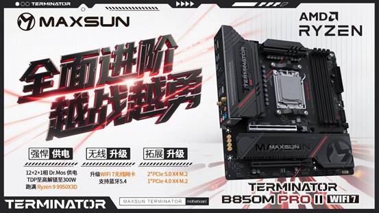 目前MS-Terminator B850M PRO II WIFI7已经在铭瑄京东旗舰店正式发售,感兴趣的用户可以前往选购,让全新终结者 PRO二代为你助力,在电竞赛场全面释放潜能,征服每一个挑战!