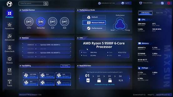 MS-Terminator B850M PRO II WIFI7 原生搭载了铭瑄全新的PTM UI BIOS。这款BIOS打破了传统操作门槛,借鉴手机APP的交互逻辑,采用PTM设计理念(PC To Mobile),将所有功能模块化后再进行聚焦式设计,让所有交互层级不超过2层,手机端的卡片式体验界面,让用户轻松、直观、简单进行个性化设置。无论新手还是资深玩家,都能轻松上手,快速调校出更佳的系统状态。