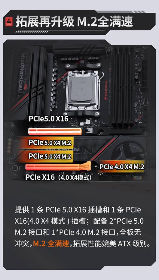 相对比一代,二代新品主板在拓展和网络方面都进行了升级。拓展方面,主板提供2个 PCIe 5.0 X4 M.2接口和1个 PCIe 4.0 X4 M.2接口,全部支持NVMe协议,M.2全满速!同时还配备1条PCIe 5.0 X16插槽(位于第一槽位,对小尺寸机箱安装更友好)和1条PCIe X16(4.0 X4模式)插槽,全板无冲突,拓展性能媲美ATX级别。