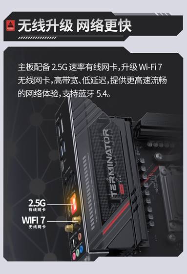 网络方面,主板升级到WiFi 7无线网卡,支持蓝牙5.4,有线方面则配备 Realtek RTL8125D 2.5G 高速网卡。无论是有线还是无线,都能提供高带宽、低延迟的网络环境,为在线学习、高清直播、高速下载和竞技游戏带来流畅稳定的连接体验。