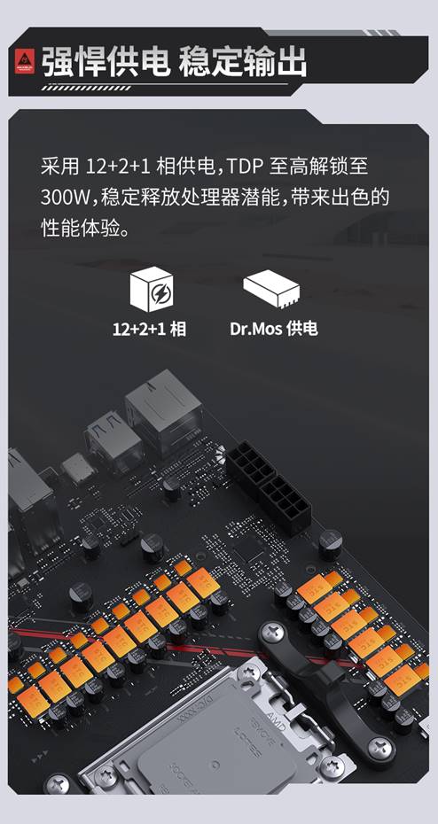 强劲性能离不开稳定供电的保障。MS-Terminator B850M PRO II WIFI7 采用 12+2+1 相 Dr.Mos 供电设计,搭配优质元器件,TDP支持至高解锁至300W。即使面对 AMD Ryzen™ 9 9950X3D等高性能处理器,也能提供持续稳定的电力输出,充分释放CPU潜能,拒绝性能瓶颈。