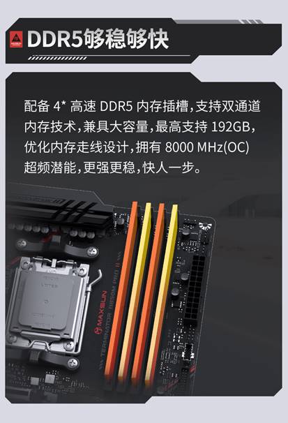内存方面,主板提供4*高速DDR5内存插槽,拥有8000MHz(OC)超频潜能,显著提升响应速度,让你在学习和娱乐中快人一步。无论是多任务处理,还是进行数据密集型操作,都能感受到内存性能提升带来的便捷体验。
