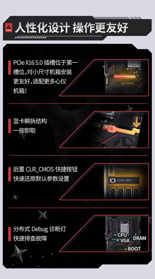 许多在一代产品上备受好评的贴心设计也延续到了MS-Terminator B850M PRO II WIFI7,如显卡瞬拆结构、分布式Debug诊断灯和CLR_CMOS快捷按钮,让用户能有更便捷省心的装机体验。