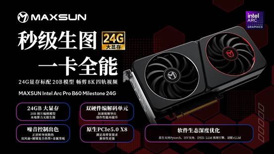 无论是追求秒级生图、流畅剪辑的内容创作者,还是追求更强悍AI性能、需要搭建多卡同步运算环境的高阶算力用户,铭瑄 Intel Arc Pro B60系列显卡都提供了值得信赖的解决方案。24G版本的MAXSUN Intel Arc Pro B60 Milestone 24G显卡以高性价比助力灵感实时落地,双GPU 48G版本的MAXSUN Intel Arc Pro B60 Dual 48G Turbo则以双芯充沛算力胜任更高阶的AI推理与开发任务。想要体验全新流畅创作之旅,或构建本地AI算力平台的用户,欢迎前往铭瑄京东自营旗舰店了解更多详情与选购!