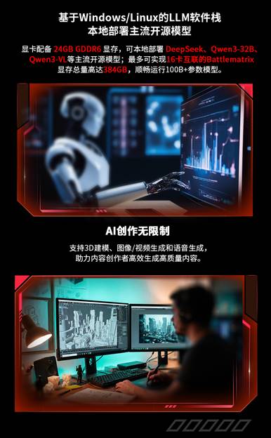 该卡创新采用双GPU设计,配备48GB GDDR6超大显存,支持多种主流大模型部署,包括DeepSeek-r1:70B蒸馏量化版、Qwen3-32B、Qwen3-VL、Qwen3-Coder-30B等,并原生支持Pytorch、ISV支持、IPEX-LLM推理引擎、适配vLLM,满足不同场景下的高性能运算需求。