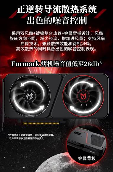 在散热与静音方面,该卡采用了正逆转导流散热系统,配备双风扇、镀镍复合热管与金属背板,在确保高性能持久释放的同时,将运行噪音控制在低水平,让创作过程更专注。