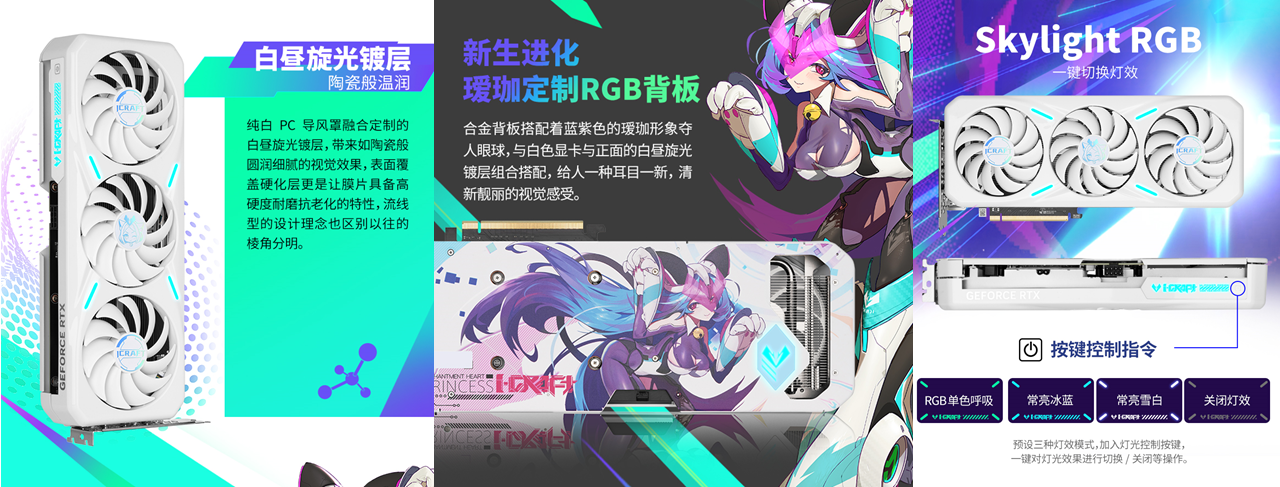 不仅性能能打,这款显卡的外观上设计清新亮眼,纯白PC导风罩融合定制白昼旋光镀层,触感如陶瓷般圆润细腻,定制瑷珈合金背板上的蓝紫色瑷珈形象灵动吸睛,与正面镀层相得益彰,为主机增添一抹清新亮眼的格调。更贴心配备一键灯光控制键,玩家可随心切换灯效,让柔和光影与《天国:拯救 2》的中世纪复古风格碰撞出独特火花,打造专属电竞氛围。